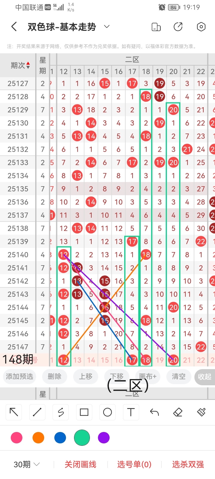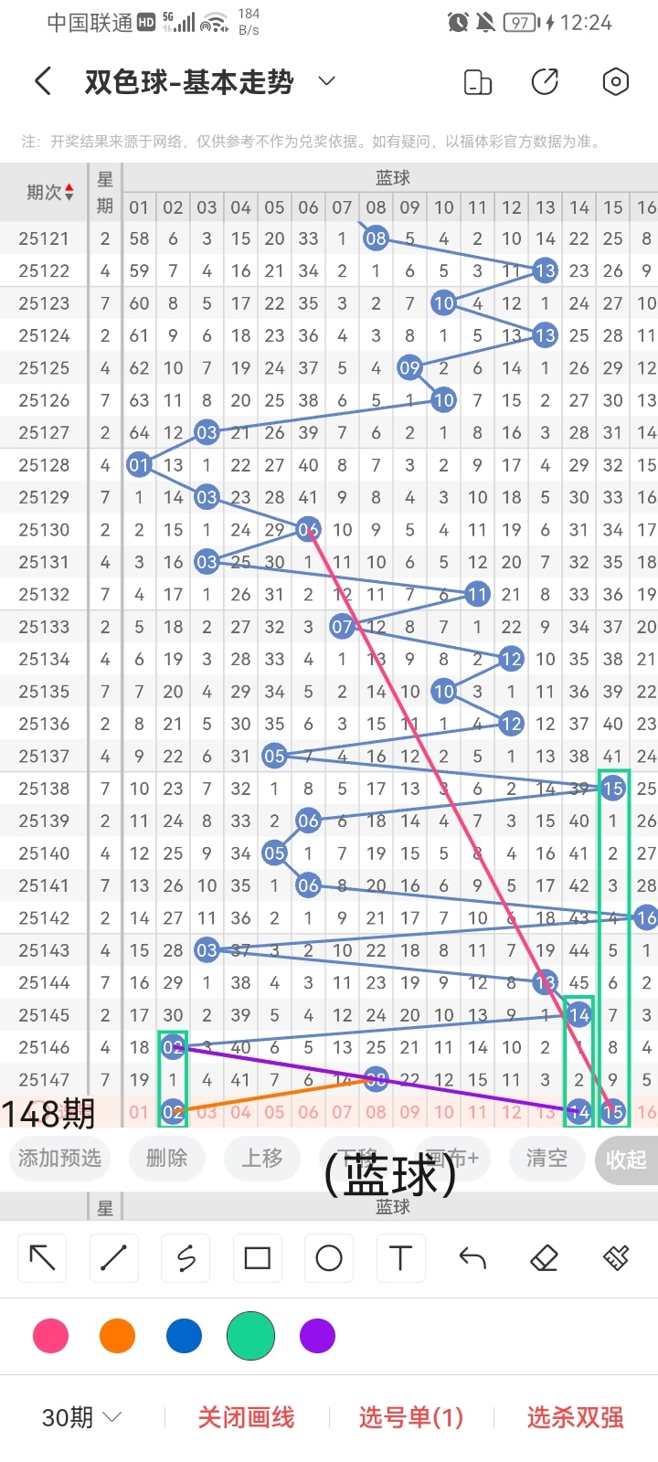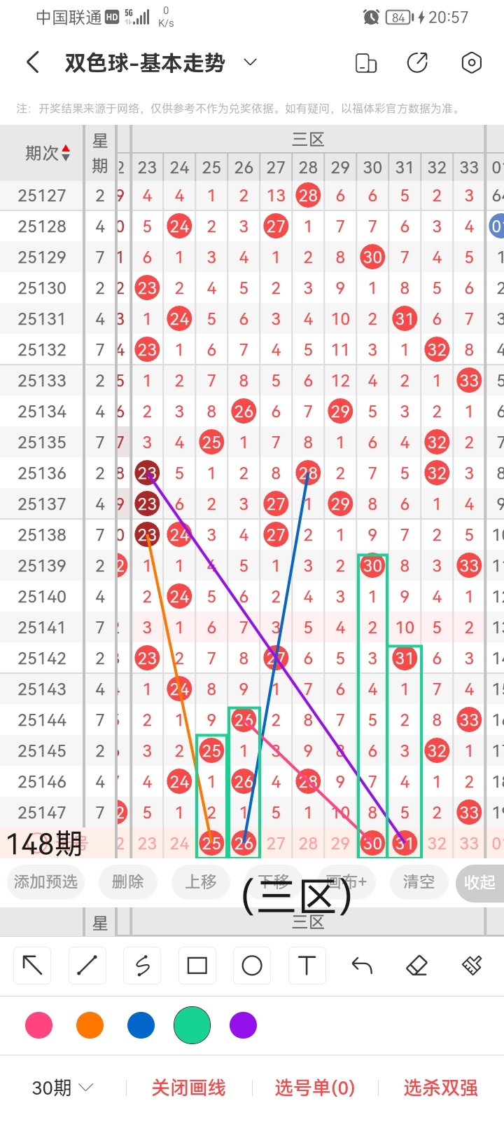 小梁根据图中画线思路,最后给大家汇总提供一下本期红球、蓝球数据,供大家参考: