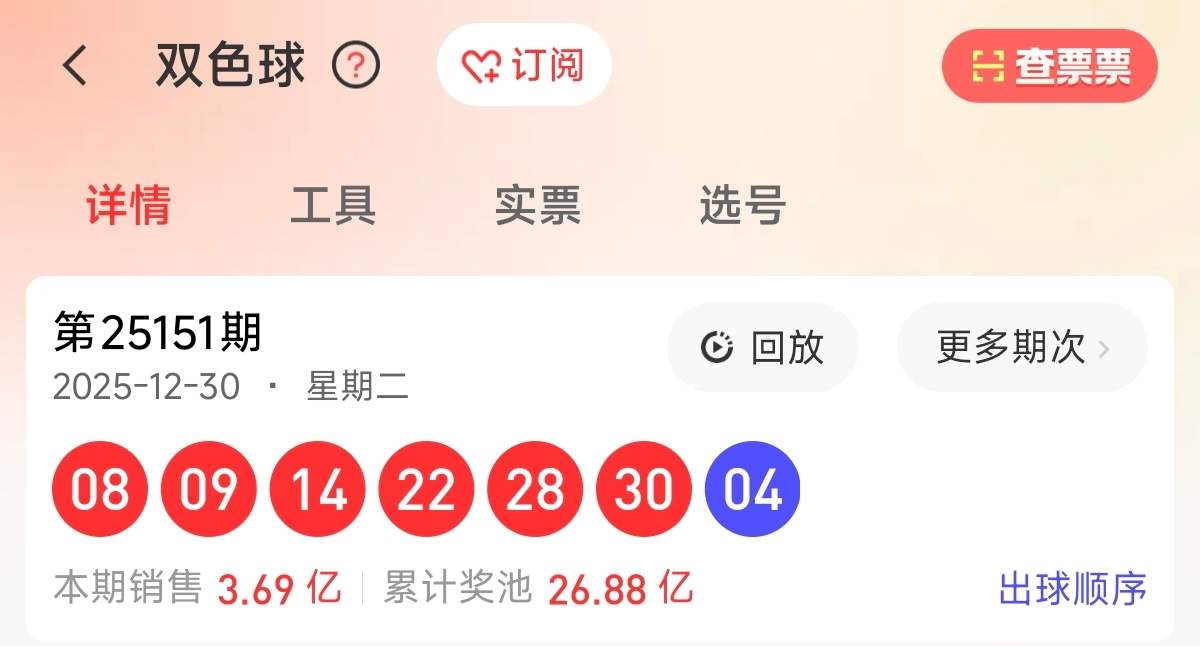 首先让我们回顾一下上期双色球25151期的开奖号码为 08、09、14、22、28、30,蓝球04。和值111,跨度22,区间比为2:2:2,奇偶比为1:5。