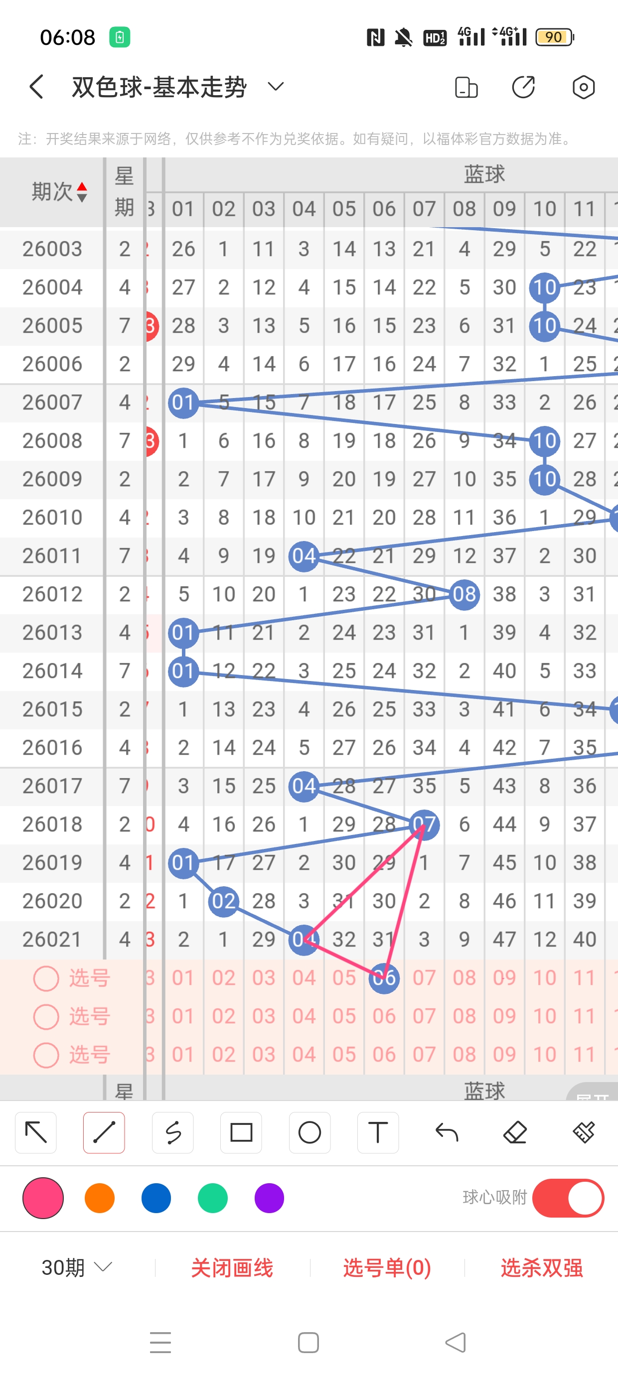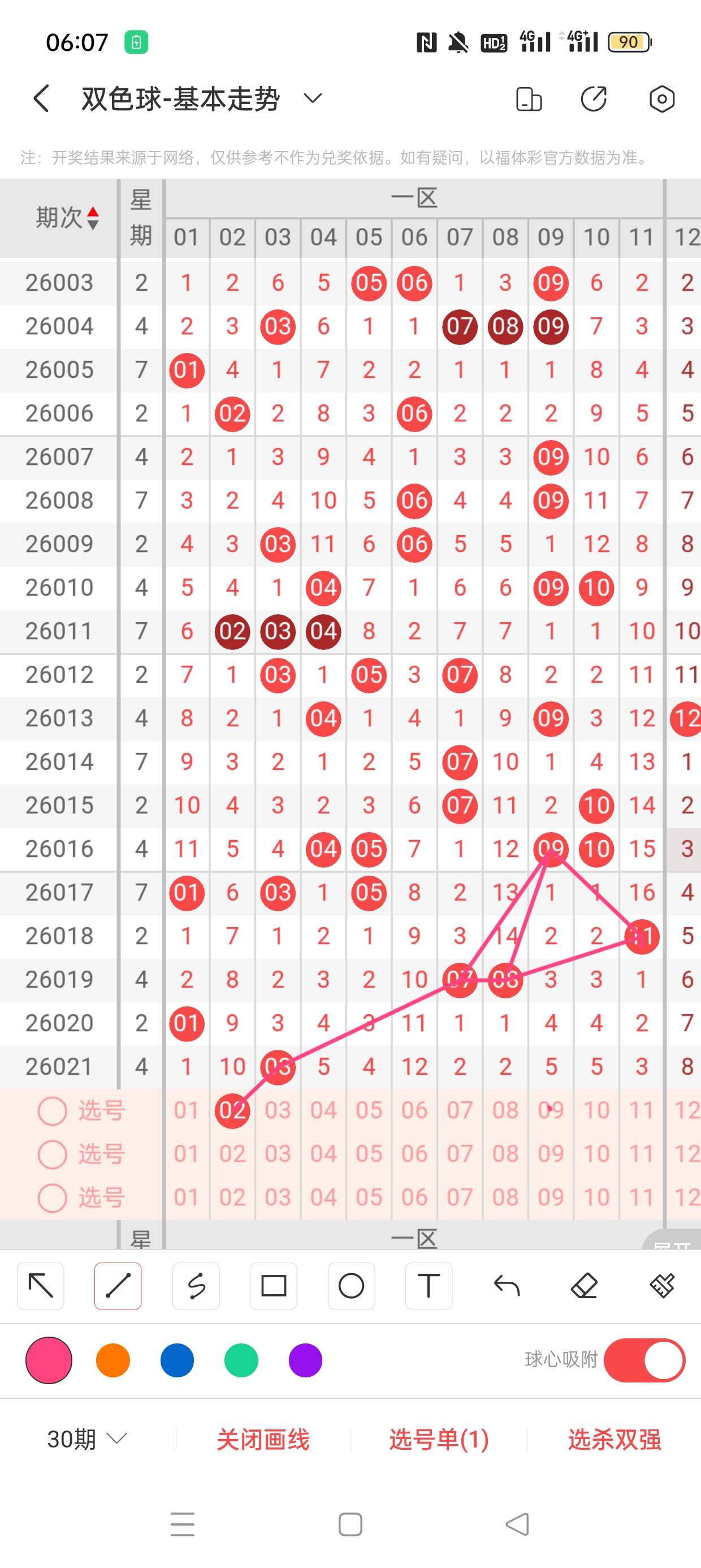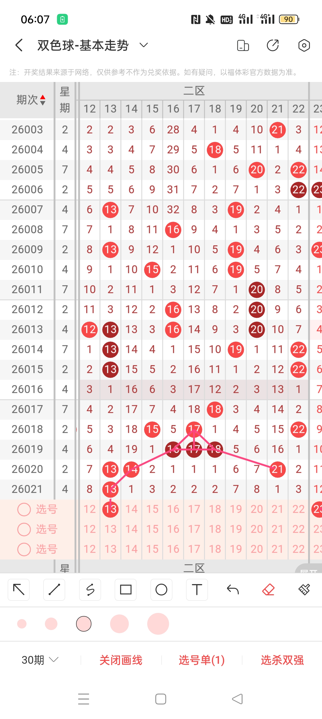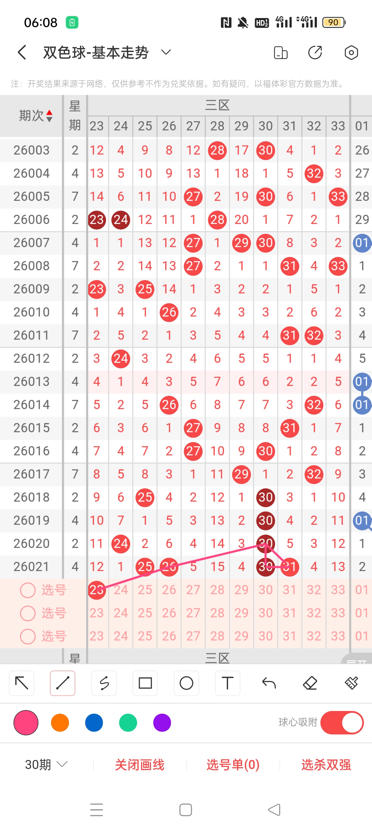 26021期开奖结果:3、13、25、26、30、31+4,奇偶比4:2,大小比4:2,和值128,012路231,邻孤传0邻4孤2传,同尾号3、13,传号30、13,连号25、26、30、31。总结完毕,下面开始本期分析。