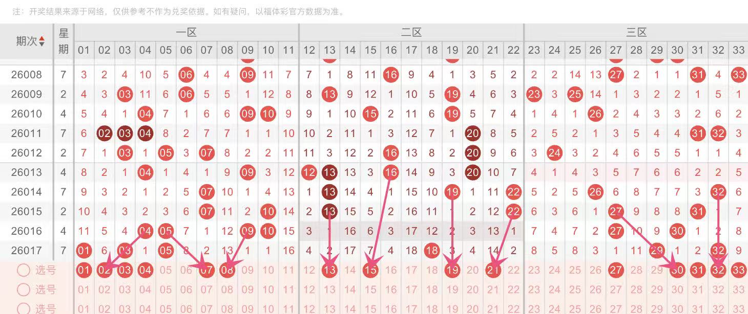 红球三区比:本期红球三区比为 3:1:2,近五期红球区间比分别为2:4:0,2:2:2,2:2:2,4:0:2,3:1:2 本期预计红球三区比为 2:3:1。