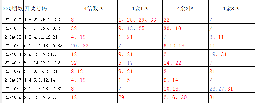 言归正传,分享常用的第一个数据分析:四分区统计数据。相对于传统的三分区,个人习惯使用四分区,就是把33个红球号码除以4,所得的余数分区如下:
