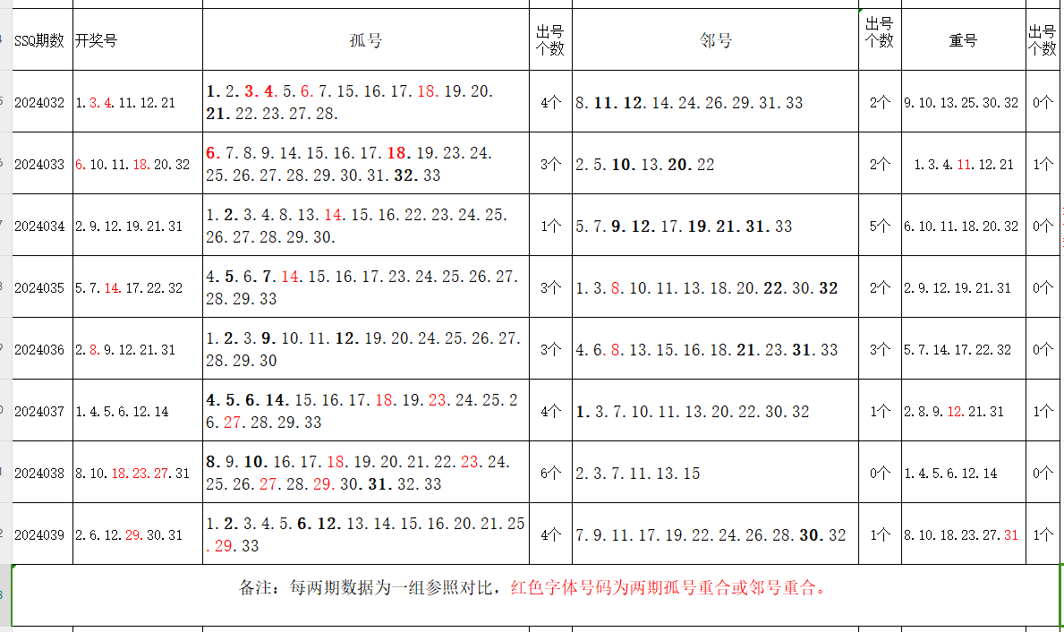 如图,先看近两期数据对比:2024037-038期,两期相同的孤号18.23.27,都在038期开出;2024038-039期,两期相同的孤号29,也在039期开出。由此可见,近两期都有的孤号、邻号,大概率会在下期开出。本期参考孤号:4.8.9.10.14.15.16.17.18.19.20.21.22.23.24.25.26.27.33;邻号:1.3.5.7.11.13.28.32;重点关注24039-040期两期相同的孤号、邻号。个人分析,仅供参考。
