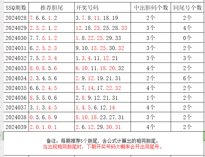 如图,每期推荐胆尾中出3个左右,稳定数据,可以做为参考。特别注意:推荐的胆尾,是按照公式计算的顺序,不是定位红球号码的顺序。当计算结果出现相同胆尾时,大概率会开出同尾号码。本期推荐胆尾:6尾/2尾/5尾/3尾/4尾。个人分析,仅供参考。