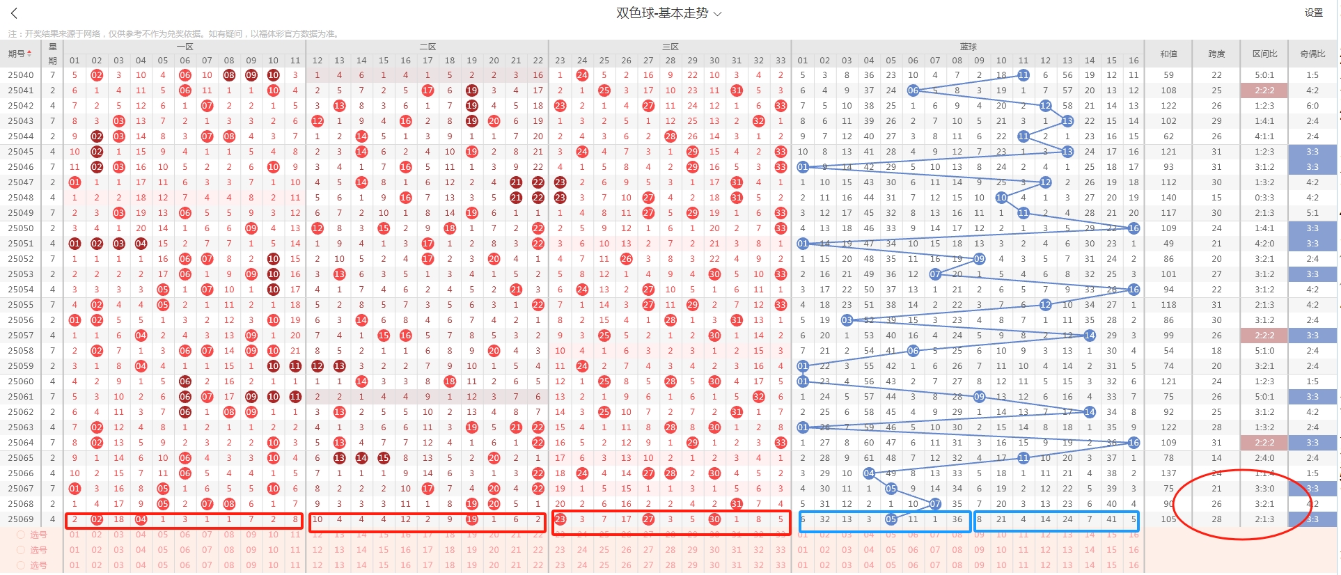 从双色球2025069期开奖号码走势图看前区红球的区间落号个数分布比例是2:1:3的区间比。从红球近5期区间比来看,一区走热后回温趋势呈现;二区本期出现降温的态势,三区本期走热趋势呈现。由以往数据统计比对,基本呈现冷暖均衡态势走势。因此判断双色球2025070期红球区间态势一区有回补趋势,一区落位2-3个号码的概率较大,因而推断一区和二区回温延续概率较大,具体区间比可参考2:2:2,防3:2:1落位走势;再看后区蓝球区间,从近5期的落位分布可以明显看出蓝球一区升温趋势显现,本期落位一区奇数,接下来落位趋势上看好二区回补态势,防一手一区延续,需要注意;