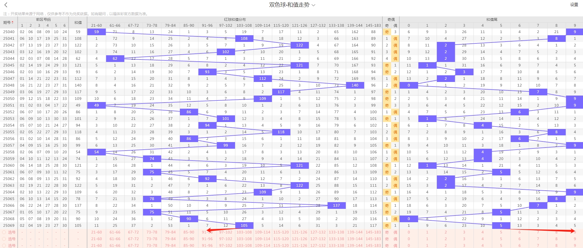 从双色球2025069期和值图上看,近期和值徘徊和值中区趋势呈现,近5期和值范围已从小和值反弹至中和值100附近区域,本期推断回撤小和值概率较大,主看小和值90-100之间区域。近10期和值在49-140之间,接下来大概小和值回补趋势,看好和值尾9尾,可关注99、109等和值,谨慎参考;