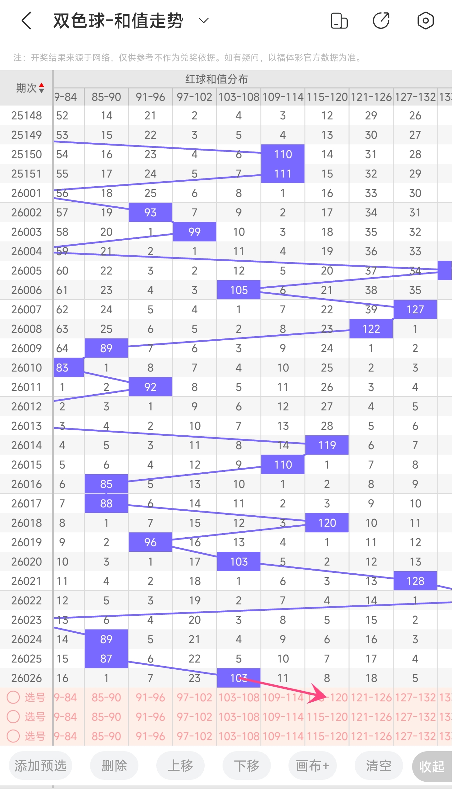 上期龙头为2,凤尾为29,跨度为27,往前一期跨度是22,偏移量为527跨度值是30期内开出比较大的跨度值。上升的空间比较小,上升空间比较小,但结合龙头凤尾走势,本期跨度可能会变大,所以推测本期跨度趋势是往右的,跨度变大,小概率往左,跨度变小。
