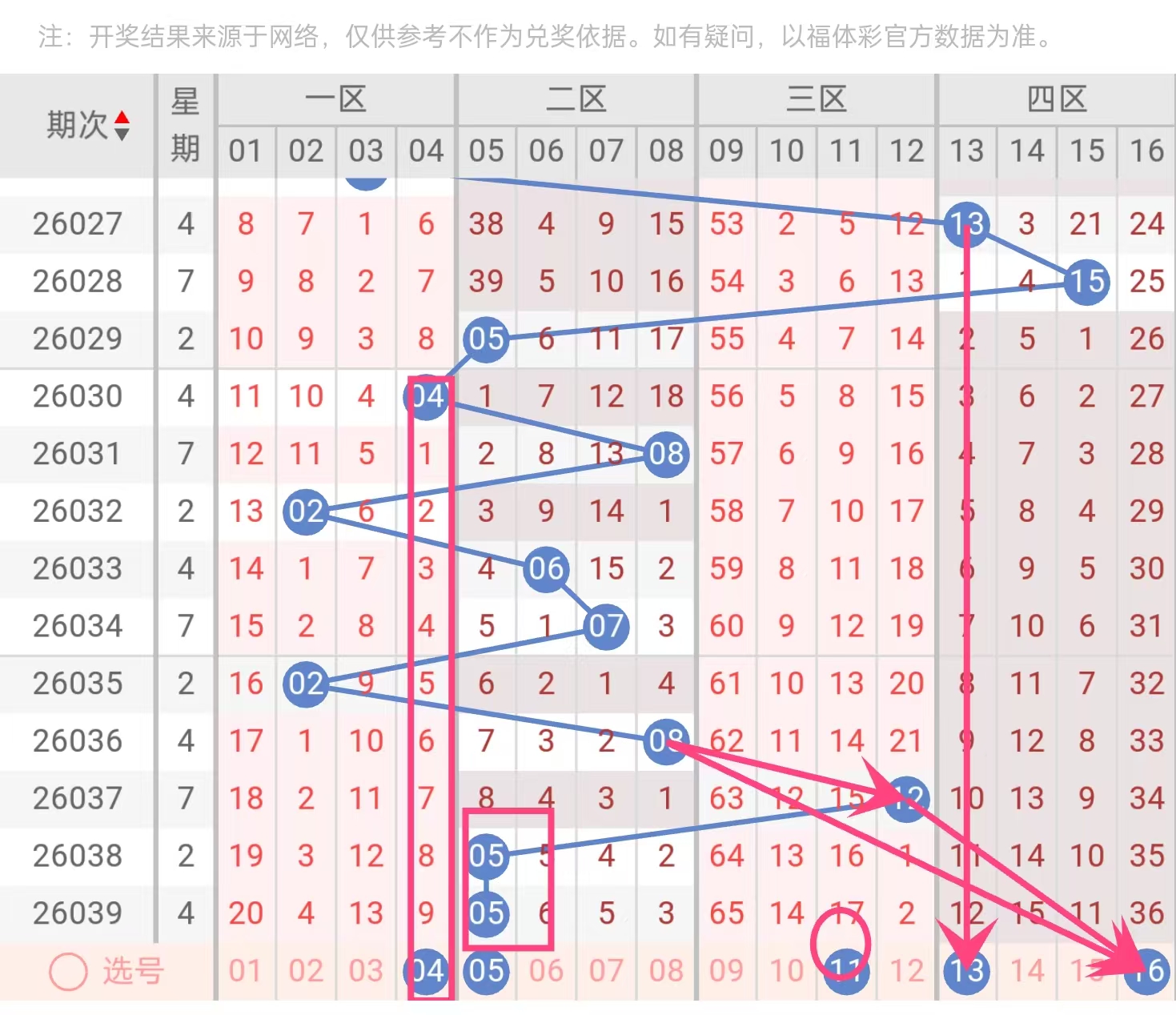 04近30期出现3次,遗漏3期(温);05出现3次(2026015、2026029、2026030),遗漏4期(温);11出现1次(2026022),遗漏13期(冷);13出现2次(2026016、2026027),遗漏4期(温);16出现2次(2026006、2026028),遗漏5期(温)。冷号11值得博,其余温热。