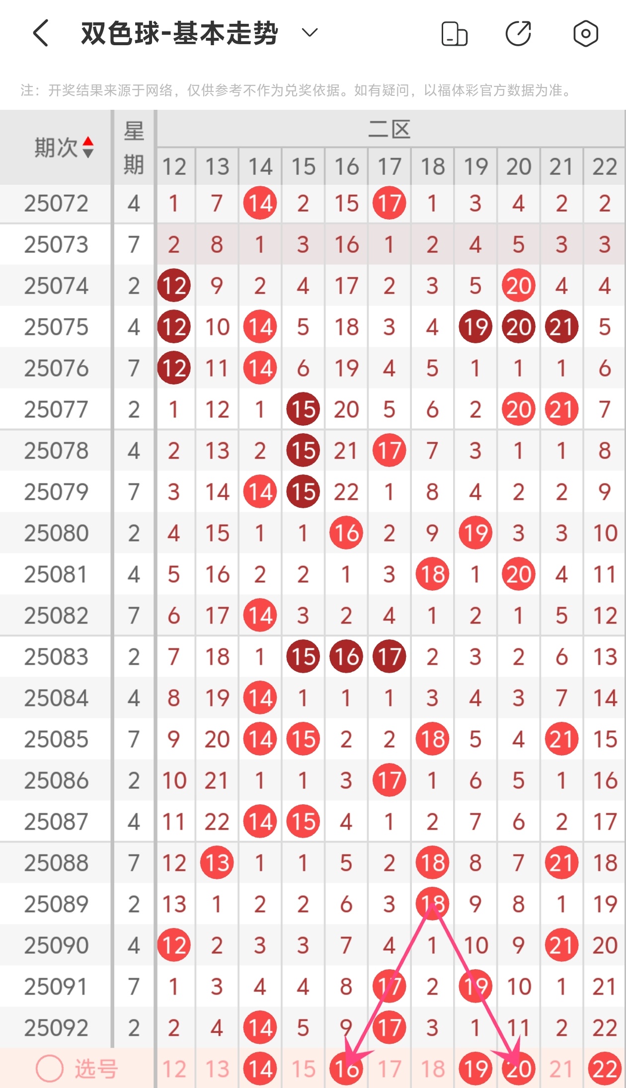 上期第二区间开出14 17,本期我们可以从上面走势图中看到选号的思路,16为斜连走势,20为斜连走势,综合以上分析本期第二区间推荐14 16 19 20 22
