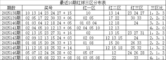 一区上期走热,开出4个红球,近10期开出22个红球,表现非常活跃,本期预计走温,开出1-2个红球,参考号码06;二区上期走温,开出1个红球,近10期共开出20个红球,出号比例与理论持平,本期看好走热,开出3个红球,注意号码121321;三区上期走温,开出1个红球,近10期共开出18个红球,出号与理论个数持平,本期预计继续走温,出现1-2个红球,看好号码2528