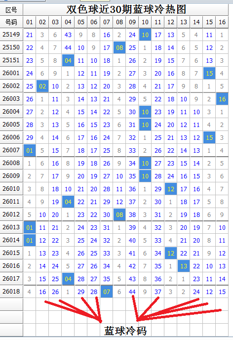 双色球近30期蓝球冷热图(数字为遗漏期数,蓝色标记的为遗漏超过10期的大冷号)