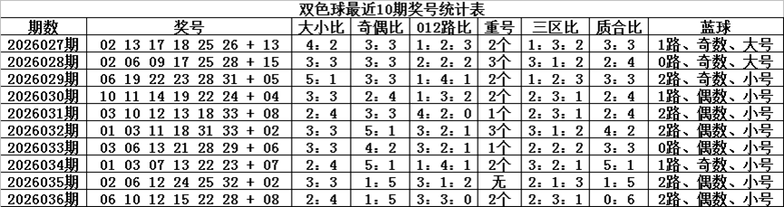 双色球第2026036期开出奖号为:06、10、12、15、22、28+08,其中红球号码奇偶比为1:5,大小比为2:4,012路比为3:3:0,和值为93,跨度为22,三区比为2:3:1,开出2个重复红球:06、12。蓝球开出偶数、小号、2路。