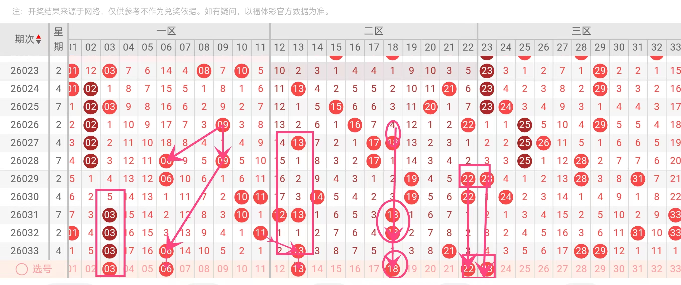 三区(23-33):热号28、31各出现2次,且28与29形成连号后隔期再现,31则与33搭配,本期可继续留意;冷号25已遗漏12期,符合冷热互补原则。