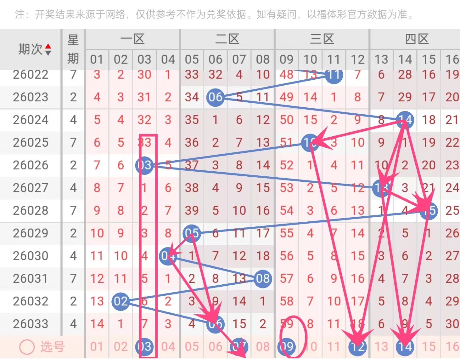一区(01-11):冷号04、08已分别遗漏13期和9期(以2026033为基准),具备反弹需求;热号01、11分别出现1次和2次,且01为前期重号,11为二区边缘,均可作为防守。