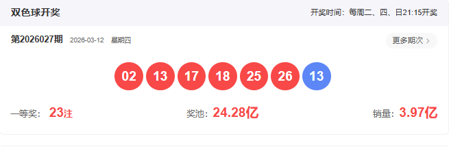 开奖号码:02 13 17 18 25 26-13