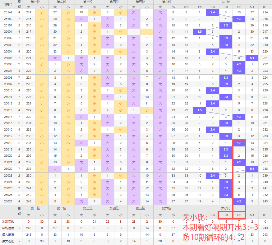 上期大小比:4:2,近10期大小比出现情况:4:2、3:3、3:3、4:2、5:1、2:4、3:3、3:3、3:3、4:2,最近10期出现5期3:3,出现3期4:2,出1期2:4,出现1期5:1,出现0期1:5,出现0期6:0,出现0期0:6,根据近10期规律本期看好隔期开出3:3,防10期循环的4:2,综上所述推荐大小比推荐:4:2,重点关注:3:3。