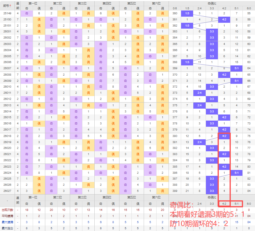 上期奇偶比:3:3,近10期奇偶比出现情况:4:2、2:4、3:3、4:2、3:3、4:2、5:1、3:3、3:3、3:3,最近10期出现5期3:3,出现3期4:2,出现1期2:4,出现1期5:1,出现0期1:5,出现0期6:0,出现0期0:6,根据近10期规律本期看好遗漏3期的5:1,防10期循环出4:2,综上所述推荐奇偶比推荐:4:2,重点关注:5:1。