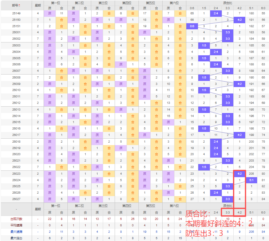 上期质合比:3:3,近10期质合比出现情况:2:4、2:4、2:4、3:3、1:5、4:2、5:1、3:3、2:4、3:3,最近10期出3期3:3,出现1期4:2,出现4期2:4,出现1期5:1,出现1期1:5,出现0期6:0,出现0期0:6,根据近10期规律本期看好斜连出4:2,防连出的3:3,综上所述推荐质合比推荐:3:3,重点关注:4:2。