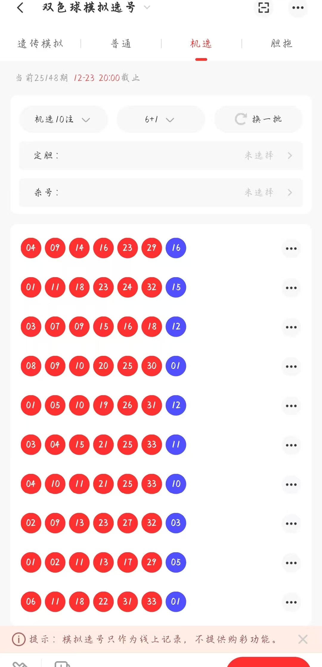 路径就是彩虹软件里面的模拟选好功能,然后选择机选,机选10注,这样我们就会得到一组10注的号码,我们需要大量的10注号码然后进行统计,我这里的选择是蓝码选择3组25注的统计,3组50注的统计,红码选择的是3组25注的统计,然后对数据进行对比研究,可以查看统计的情况记录,如下图(关注必杀蓝码重点:连续的组数据进行从下面开始网上开始10个码,然后通过两两对比,得出相同出号的作为选码,如果超过了5个号码就人工的筛选杀号,凑到5码均可,这里有一个重点就是每一组数据都是通过上面截图的办法出来的25组单注,然后通过3次25组单注的合计出来一组蓝码,通过这样的方式出来的选号,准确率尚且较高,可以有不少的参考价值)