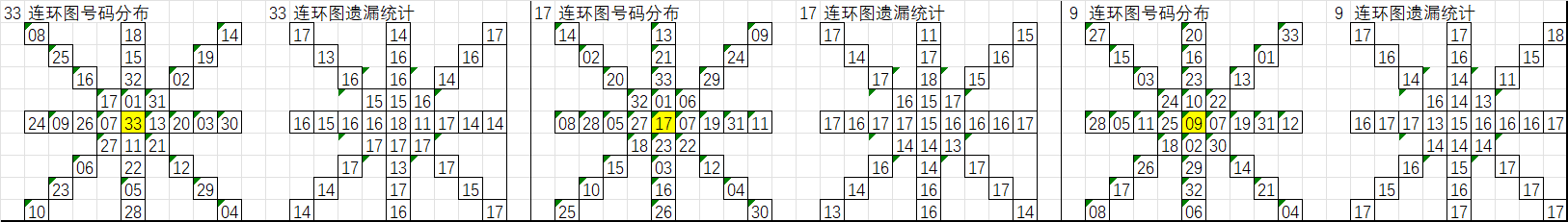 由于数据量大,不一一统计,下图为各个号码分别在33、17、9连环图上的遗漏统计汇总图: