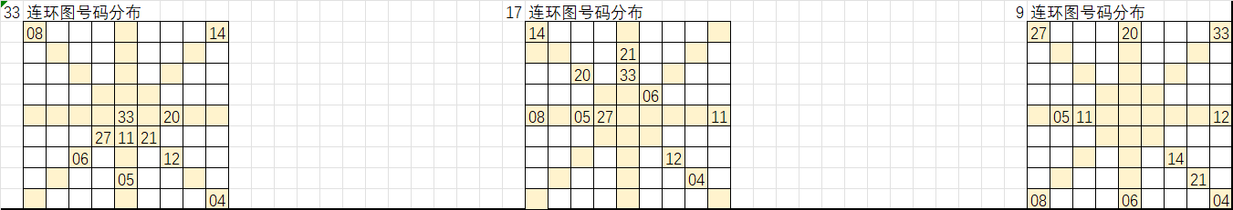 以上是遗漏大于16的号码分别在33、17、9连环图的分布,按照九转连环图选号规律,选取这些号码“环上”和“轴上”的相邻号码作为胆码,把这些胆码进行次数统计即可形成我们组号的排序,从出次多到少进行取号得出我们的大底。