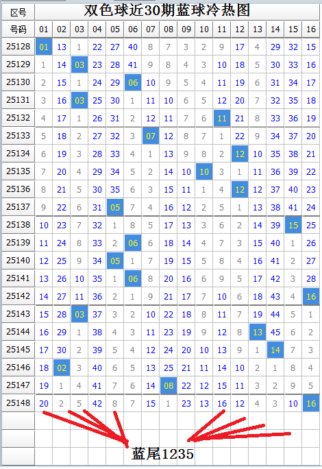 蓝球本期有热蓝8枚,冷蓝8枚,蓝球热码数量一样。上期开出热蓝,由于近期蓝球冷热交替开出规律不明显,本期蓝球冷热难定。