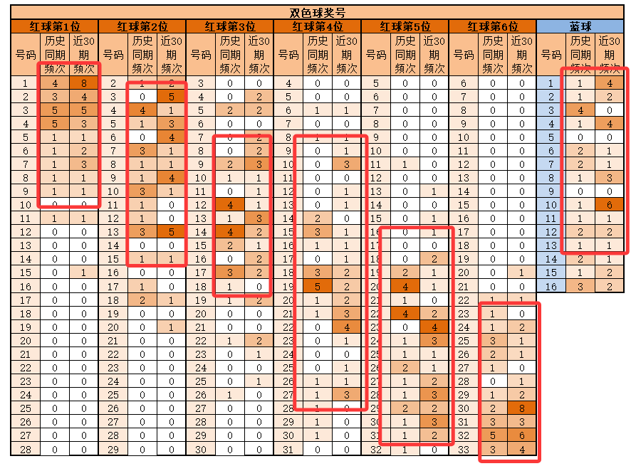 第6位,基本在24-33之间,历史同期频次最多的32;近30期,频次最多的为30,明显特征是合数优势;推荐重29-30-31-32-33。