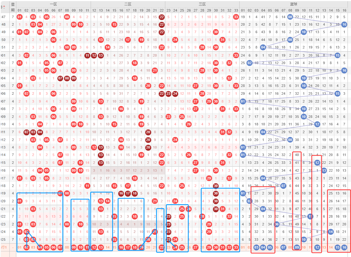 蓝球,历史同期频次最多的为3;近30期,频次最多的为10,明显特征是01路小优势;推荐重点1-2-4-8-10-12-15-16。