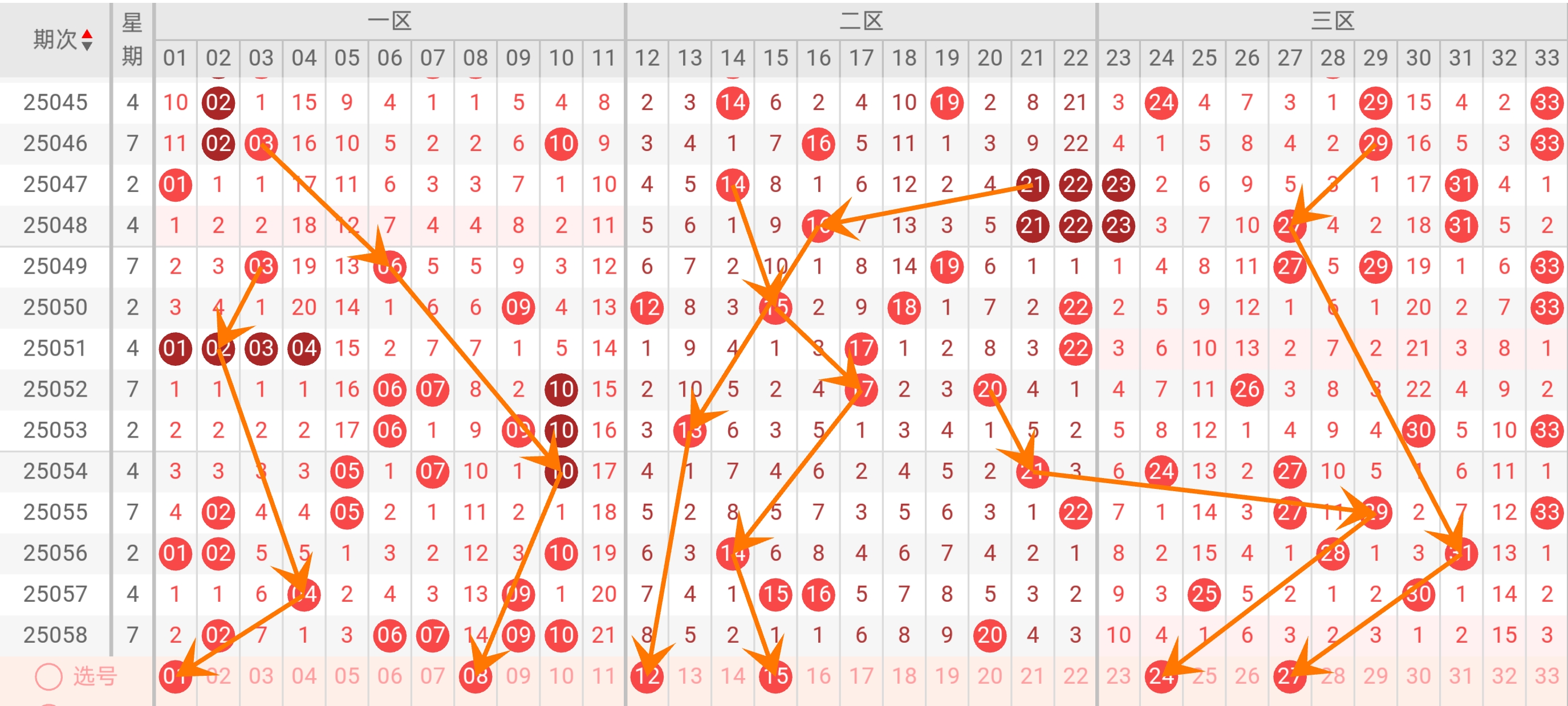 前区:每个区间选2个号,冷号01、24搭配中频号08、12、15、27。