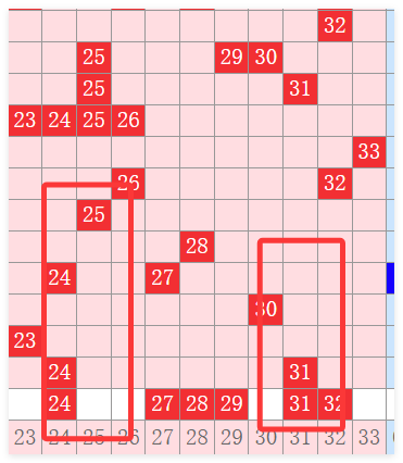 接着,我们看一下三分区红球的三区是23号到33号这个区间上去开出了2431。那么本期的话,我们要考虑重号24号是否进行重复,其次要考虑小于31号的号码有开出重点关注二十七二十八二十九。那么结尾的话,有可能会在282932这三码中间产生。那么比较倾向于的话在272829这里