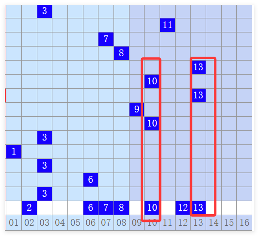 最后我们看一下蓝号,蓝号上期又开了一个隔期7号的三直连03号,这个是一个等局的一个隔期号码。那本期的的话,如果是考虑的话跨度比较小,我们还是要考虑这个06也甚至也要考虑02。那么往大的跨度来走的话,可能要考虑到十十一十二十三十四。这里本期的蓝号的走势也不是很明朗,那么,如果我们考虑走大跨的话,要考虑大于10的号码,也就是 10到13之间。