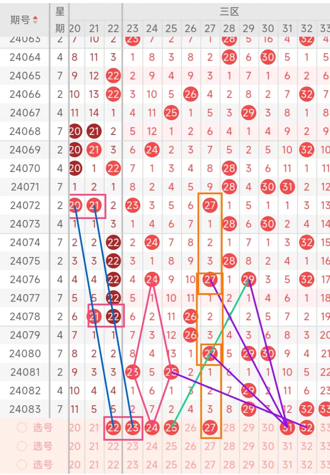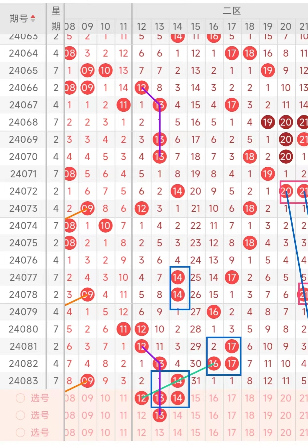 今天选号的重点,个人感觉应该是20区,因为这个区域已经连续大跨度空两期,今天的空位预测应该有连号出现,至于几个连号就要看主任脑洞大不大了。