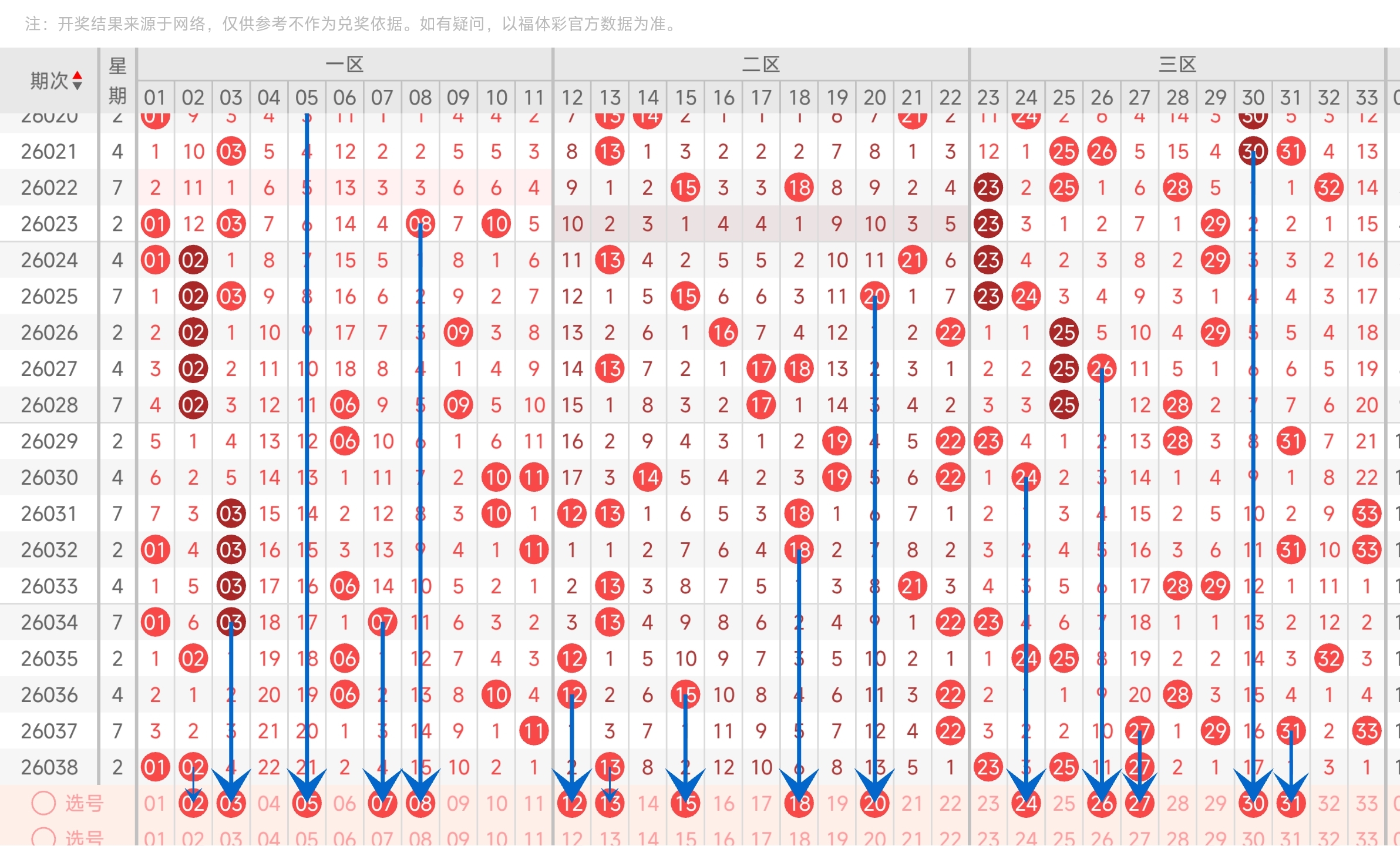 上一期三区开出了232527号球。往前一期开出了27293133号球。通过走势图分析,可以看到上期三区开了3码,目前三区比较热门,但不排除本期三区继续降温的可能。上期开号主要在左边,本期继续关注,然后就是防一下右边的号码开出凤尾。最后再结合冷热号和遗漏期数,本期我们可以关注2426273031等号。综上所述本期我们推测有可能开出2426273031等号码。