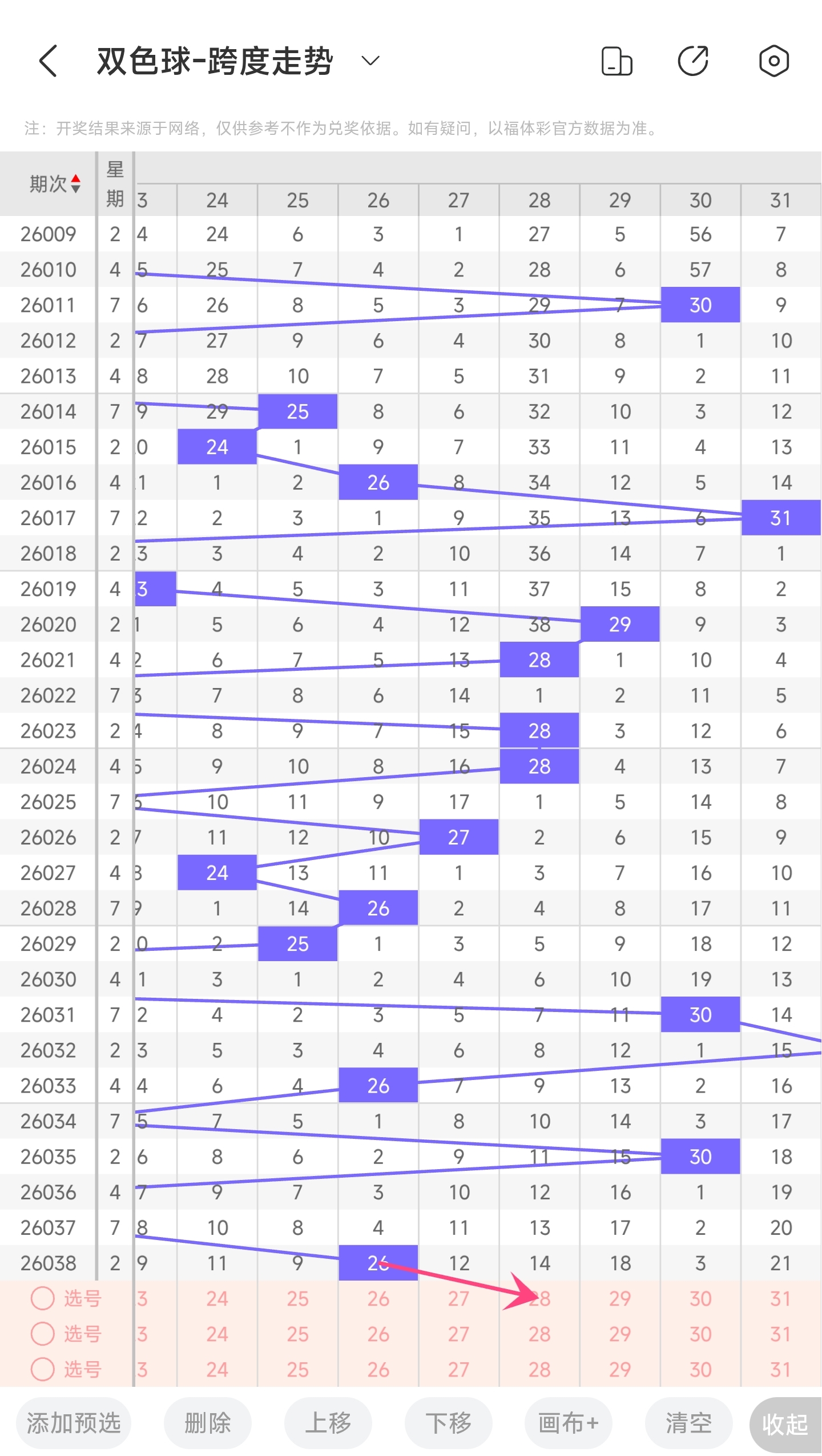 上期龙头为1,凤尾为27,跨度为26,往前一期跨度是22,偏移量为426跨度值是30期内开出中间的跨度值。下降的空间和上升空间差不多,再根据最近龙头凤尾走势,本期跨度可能会变大,所以推测本期跨度趋势是往右的,跨度变大,小概率跨度变小。