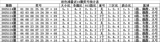 双色球第2025123期开出奖号为:07、09、23、24、25、26+10,其中红球号码奇偶比为4:2,大小比为4:2,012路比为2:2:2,和值为114,跨度为19,三区比为2:0:4,开出1个重复红球:25。蓝球开出偶数、大号、1路。