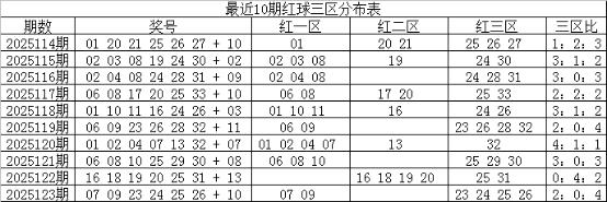 一区上期走温,出现2个奖号,近10期开出23个红球,表现非常活跃,本期预计走温,开出1-2个红球,参考号码04、06;二区上期走冷断区,近10期共开出11个红球,走势相对较冷,本期预计继续温冷,在2个以内出号,注意号码22;三区上期表现较热,出现4个奖号,近10期共开出26个红球,出号比例相对较高,本期看好再次热出,关注3个红球,看好号码24、29、32;