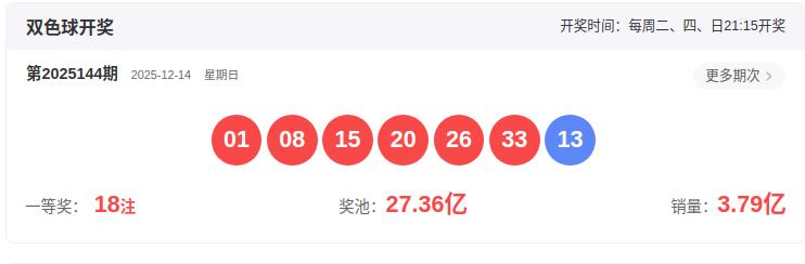 开奖号码:01 08 15 20 26 33-13