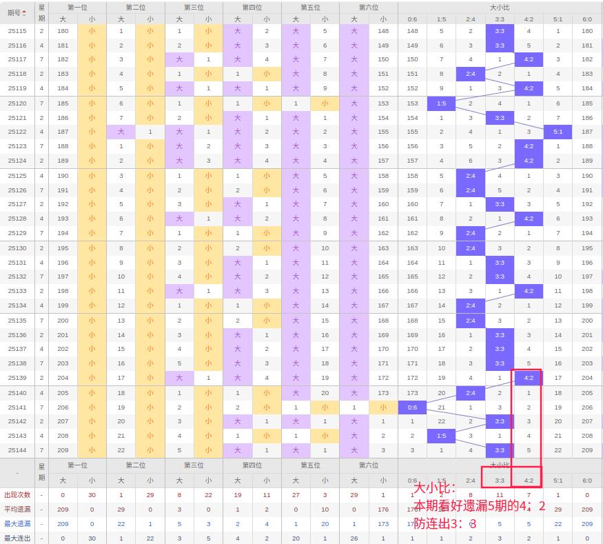 上期大小比:3:3,近10期大小比出现情况:2:4、3:3、3:3、3:3、4:2、2:4、0:6、3:3、1:5、3:3,最近10期出现5期3:3,出现1期4:2,出2期2:4,出现0期5:1,出现1期1:5,出现0期6:0,出现1期0:6,根据近10期规律本期看好遗漏5期的4:2,防连出3:3,综上所述推荐大小比推荐:3:3,重点关注:4:2。