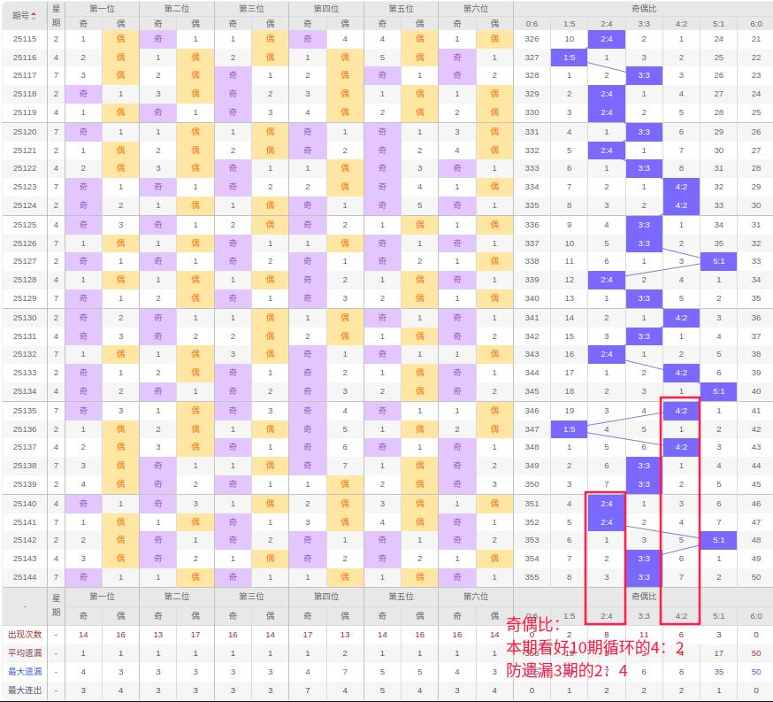 上期奇偶比:3:3,近10期奇偶比出现情况:4:2、1:5、4:2、3:3、3:3、2:4、2:4、5:1、3:3、3:3,最近10期出现4期3:3,出现2期4:2,出现2期2:4,出现1期5:1,出现1期1:5,出现0期6:0,出现0期0:6,根据近10期规律本期看好10期循环的4:2,防遗漏3期的2:4,综上所述推荐奇偶比推荐:2:4,重点关注:4:2。