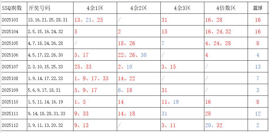 分享第一个数据分析:四分区统计数据。相对于传统的三分区,个人习惯使用四分区,就是把33个红球号码除以4,所得的余数分区如下: