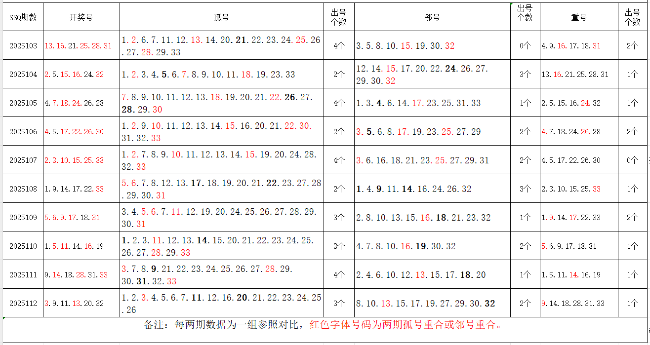 如图,以近两期数据为一组,进行对比分析。相同的孤号、邻号,可能在下期出1-4个左右。上期开出孤号3个,邻号2个,重号1个。本期参考孤号:1.5.6.7.15.16.17.18.22.23.24.25.26.27.28.29.30.;邻号:2.4.8.10.12.14.19.21.31.33;孤、邻号重合号码精选:***(会员专区可见)。个人分析,仅供参考。