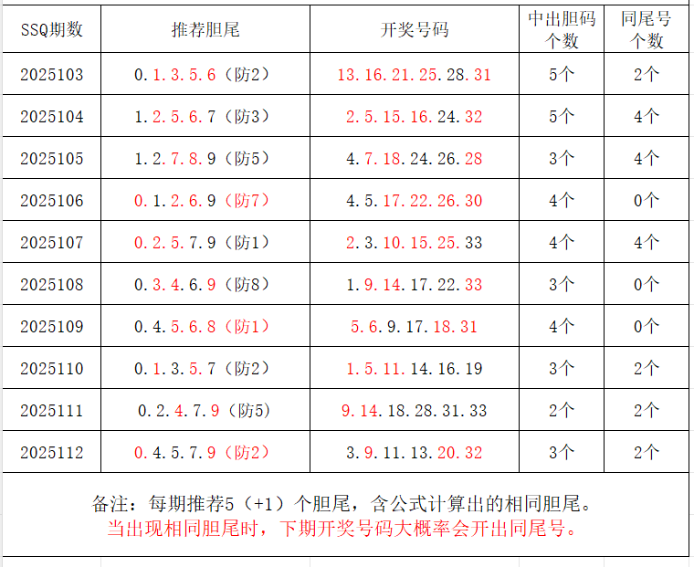 如图,每期推荐胆尾中出1-4个。上期推荐胆尾中出3尾3码!推荐胆尾是按照公式计算的顺序,不定位红球号码的顺序。本期推荐胆尾:5尾/1尾/4尾/9尾/0尾 。加推重点胆尾:***(会员专区可见)。推荐胆码号码:***(会员专区可见)。个人分析,仅供参考。