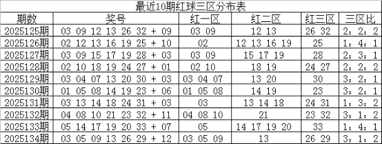 一区上期走热,开出3个红球,近10期开出21个红球,走势与理论相当,本期看好转热,开出3个号码,参考号码060810;二区上期走温,开出1个红球,近10期共开出24个红球,出号比例相对较高,本期预计走温,开出1-2个红球,注意号码13;三区上期走温,开出2个红球,近10期共开出15个红球,走势相对较冷,本期预计继续温冷,看好号码2428