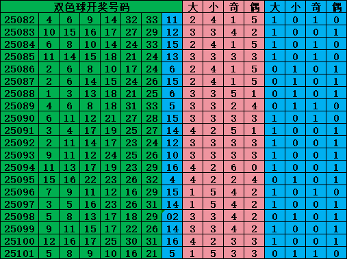 双色球红球每期是从01-33的号码里每期开出6个红球,01-16号是小号,17-33号是大号,尾数13579是奇数号,02468是偶数号。蓝球每期是从01-16号里开出1个蓝球,01-08是小号,09-16是大号,尾数13579是奇数号,尾数02468是偶数号。