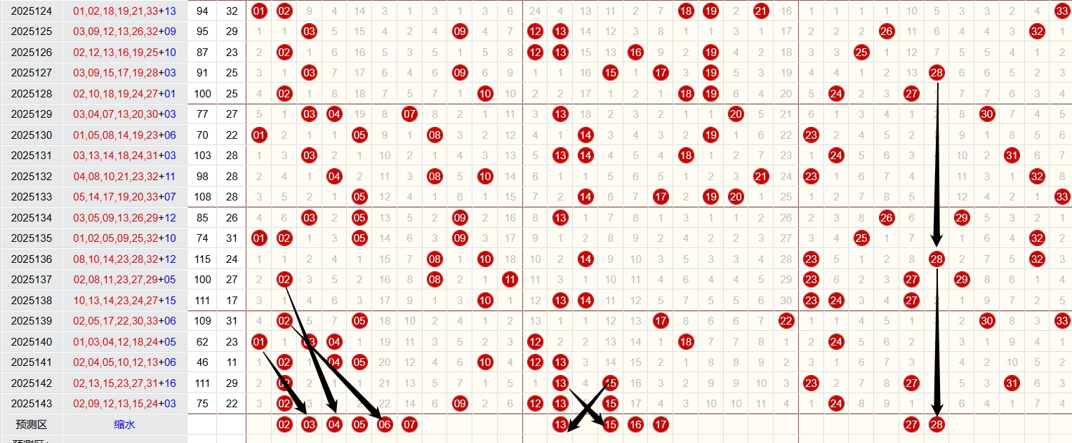 回顾上期251402开奖02 09 12 13 15 24 + 03 ,其中一小区01-11出2个,二小区12-22出3个号,三小区23-33出1个!