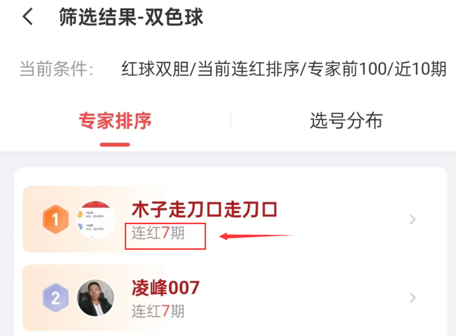 这样,我们就得到了一个专家推荐的排序页面。我们先看排名第一的专家,连胜期数。小编的过往经验认为,连胜期数大于等于5期,为有效参考数据。如若低于5期,我们回退选择“红球三胆”,或其他同类型的选择项目,得到大于等于5期的列表为止。这个排名数据是最真实直观的,推荐对了就晋级排名,能帮我们去伪存真,找到真正有效靠谱的数据。而我们要做的就是站在巨人的肩膀上整合资源,离大奖更近一步!