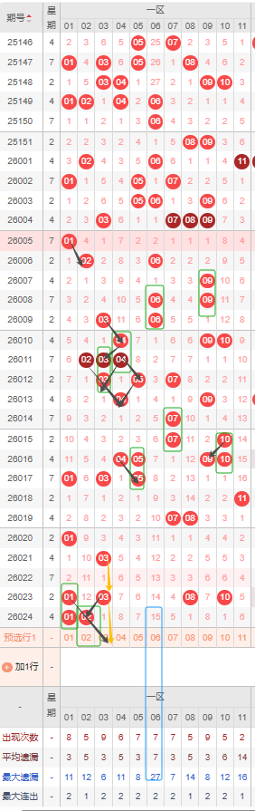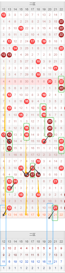 一区本期选号建议首先考虑遗漏期数较大的号,06号达到了十期以上且已到达其最大遗漏期数,是目前一区遗漏期数最大的号建议防冷号开出。其次隔断号还可以考虑03号,03号上一次开出间隔1期,若本期开出将形成1-1的形态规律,可以考虑开出。最后09号近20期开出都较为频繁,但上一次开出已经间隔了8期,本期可能会让09号回归。