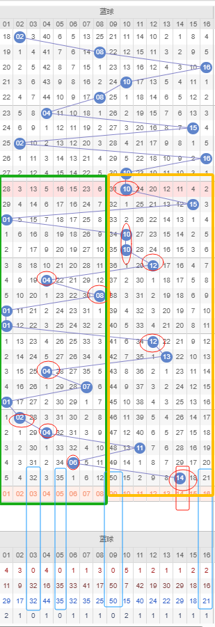 双色球上期蓝号开出一个大号偶数14号,近二十期开出了九期大号和11期小号,而近几期内开出小号后基本连出之前连出五期小号了,那么本期开出大号的概率较大,而且有十期没出现重号了,那么本期首先考虑继续开出14号形成重号。如图所示蓝区的遗漏期数大的冷号很多,可以考虑遗漏期数较大的大号,比如09号、16号。