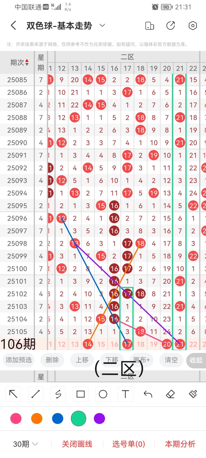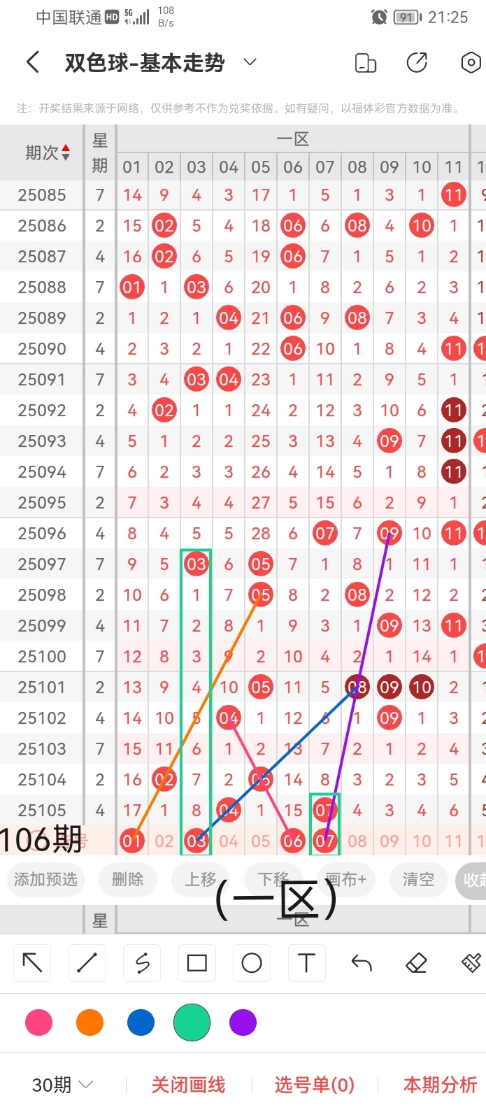 通过以上对上期的简单回顾,下面进入双色球第2025106期(下面简称本期)的选号分析: