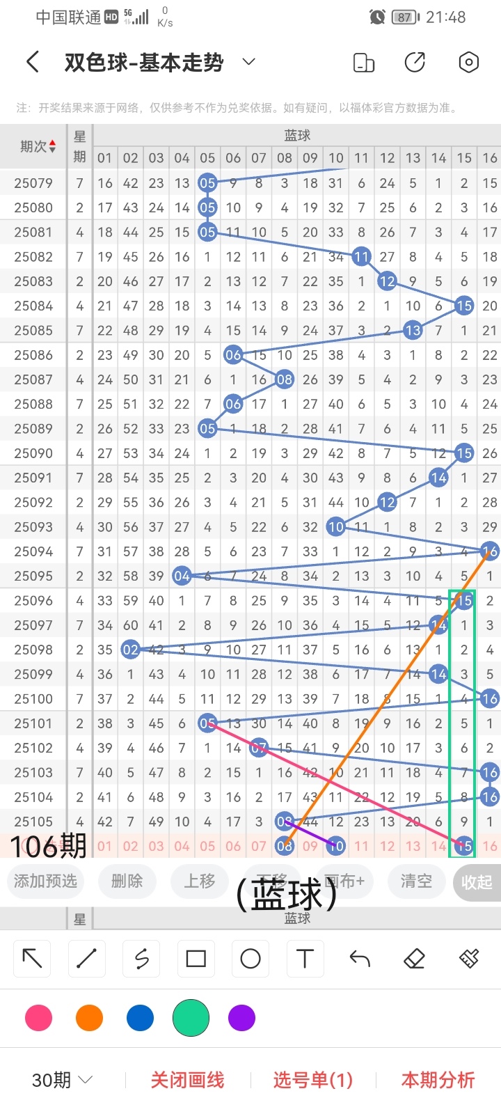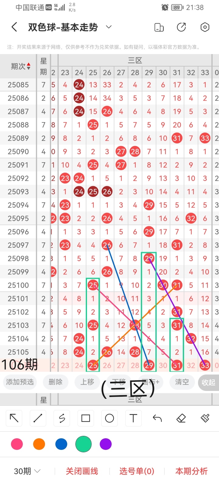 小梁根据图中画线思路,最后给大家汇总提供一下本期红球、蓝球数据,供大家参考:
