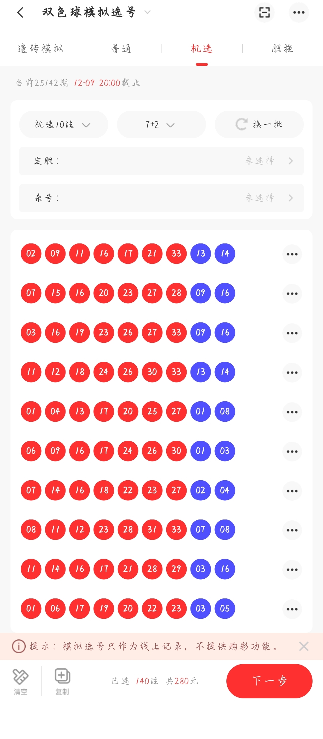 路径就是彩虹软件里面的模拟选好功能,然后选择机选,机选10注,这样我们就会得到一组10注的号码,我们需要大量的10注号码然后进行统计,我这里的选择是蓝码选择3组25注的统计,3组50注的统计,红码选择的是3组25注的统计,然后对数据进行对比研究,可以查看统计的情况记录,如下图(关注必杀蓝码重点:连续的组数据进行从下面开始网上开始10个码,然后通过两两对比,得出相同出号的作为选码,如果超过了5个号码就人工的筛选杀号,凑到5码均可,这里有一个重点就是每一组数据都是通过上面截图的办法出来的25组单注,然后通过3次25组单注的合计出来一组蓝码,通过这样的方式出来的选号,准确率尚且较高,可以有不少的参考价值)